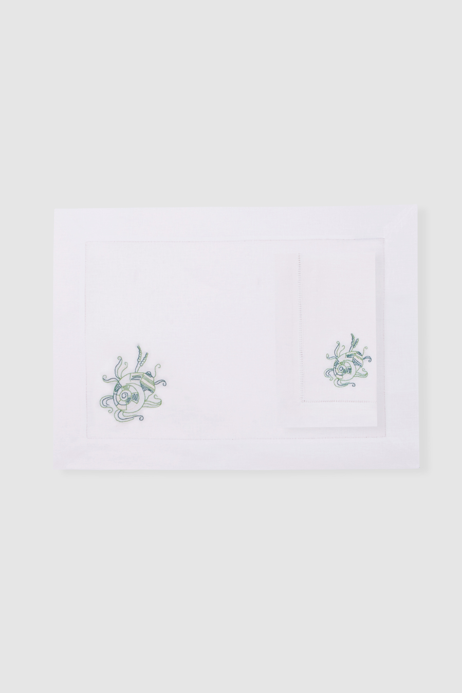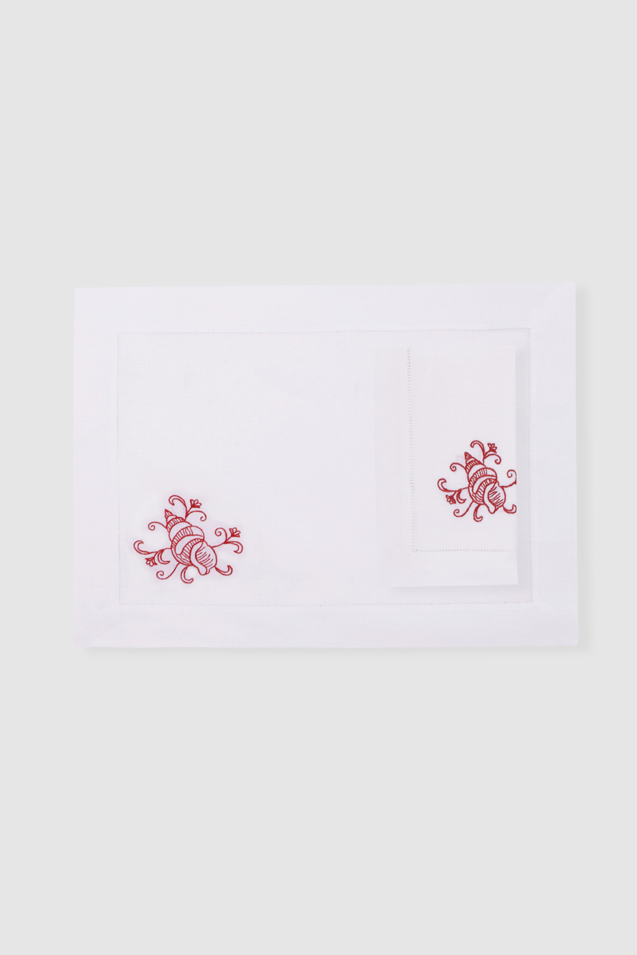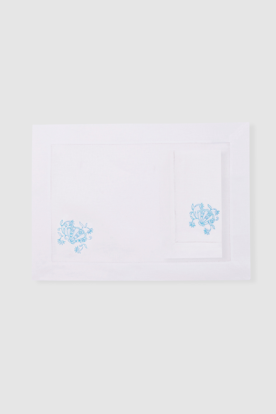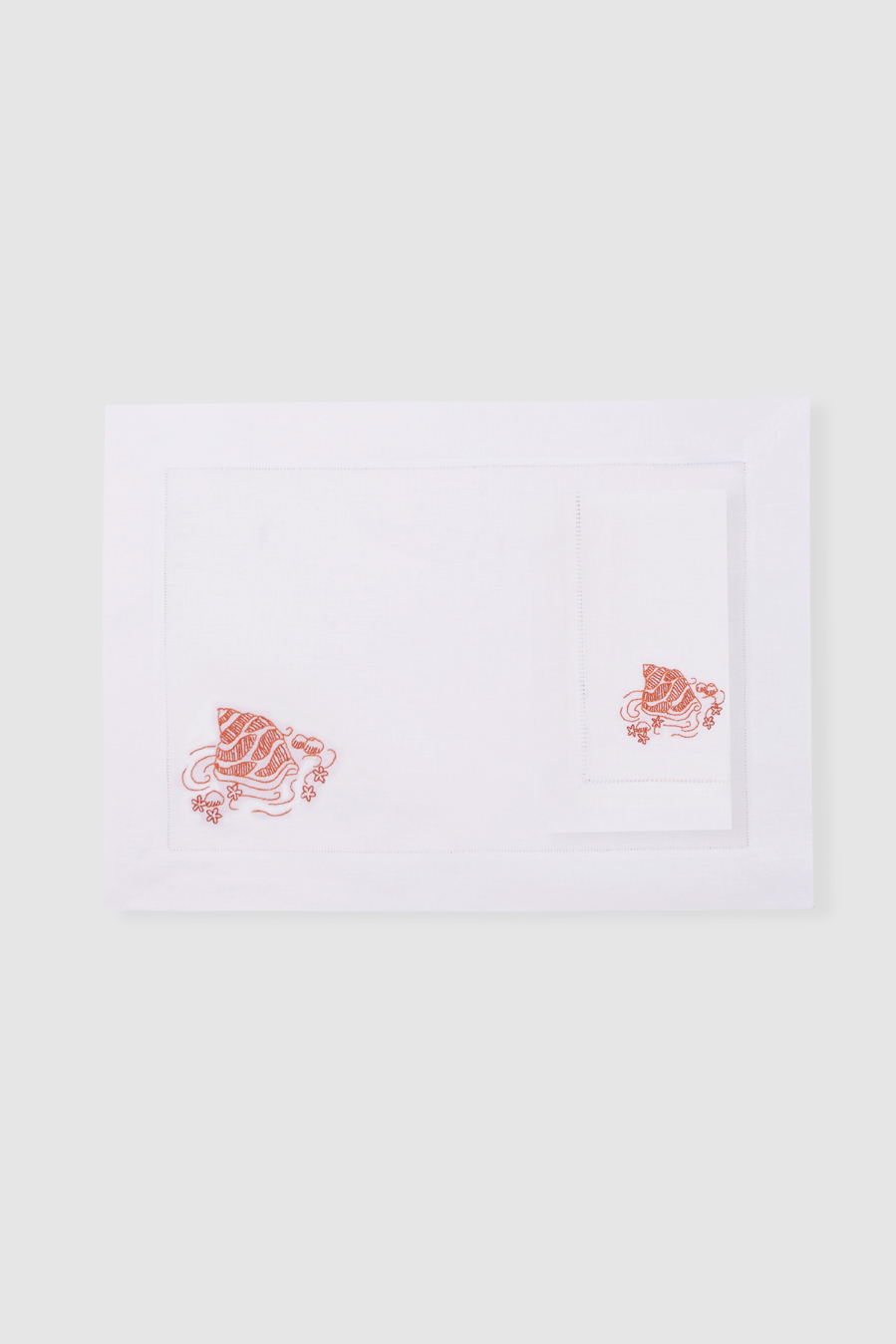 Pack de 6 individuales y 6 servilletas de lino con motivos de caracolas bordados a mano.