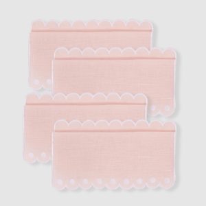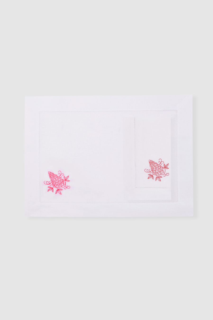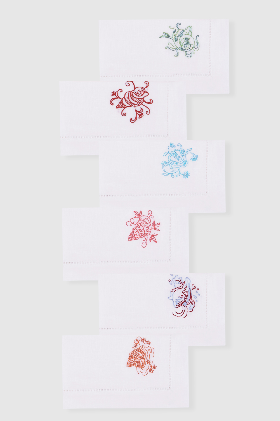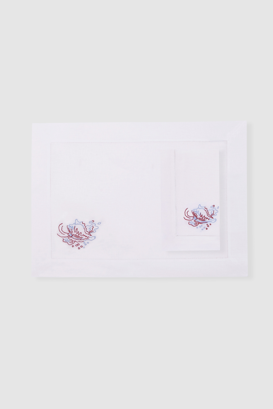 Pack de 6 individuales y 6 servilletas de lino con motivos de caracolas bordados a mano.