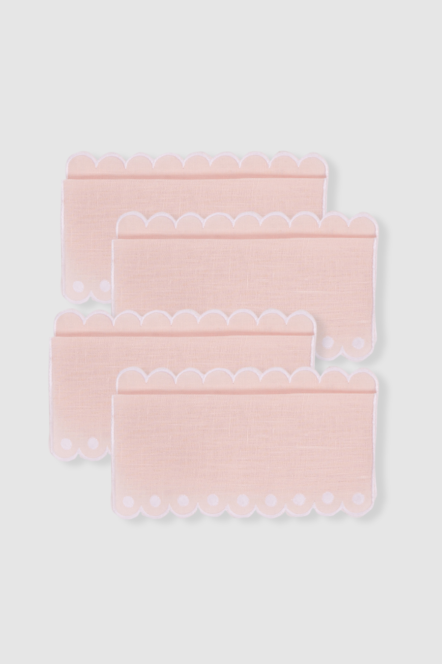 Pack de cuatro servilletas de cocktail de lino rosa claro con terminación en ondas.