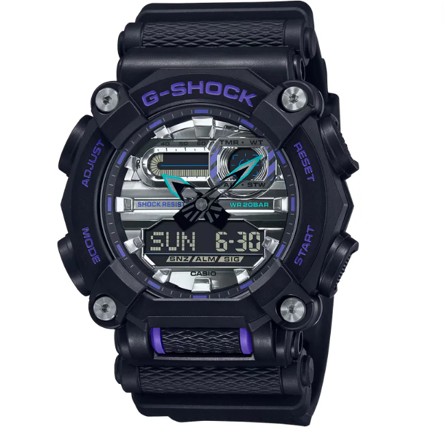 Colores excepcionales del GA-900 Llame la atención y capture miradas con un reloj G-SHOCK que presenta un deslumbrante toque de color. El diseño evoca una sensación industrial con un bisel de 10 facetas acentuado con cuatro tornillos, lo cual evoca las tuercas y tornillos del diseño mecánico. Las agujas y el dial están tratados con un acabado de deposición de vapor en brillo metálico para agregar un toque de elegancia. Una superficie cuadriculada antideslizante donde la necesita (la correa, los botones laterales y frontales) proporciona una sorprendente facilidad de uso y una funcionalidad total. Colóquese este resistente G-SHOCK de estilo laboral para aumentar su confianza y estilo.