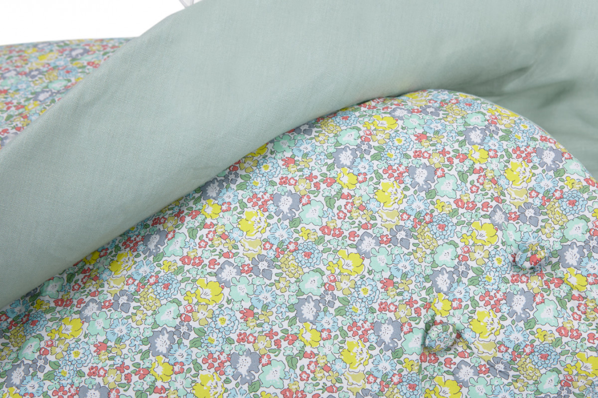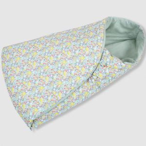 Saco para bebé en tejido Liberty of London en exterior y lino en el interior. Su relleno acolchado mantiene la temperatura del bebé. Se cierra mediante botones laterales. Este saco es ideal para bebés de 0 a 5 meses aproximadamente.
